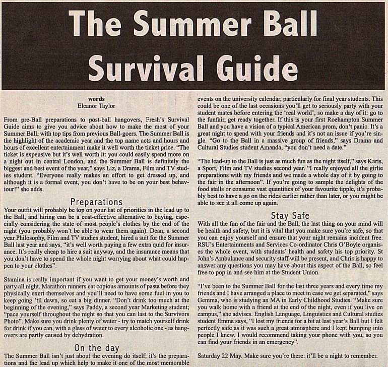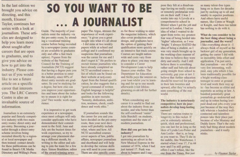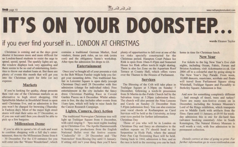 I wrote two regular series (travel ‘It’s On Your Doorstep’ and careers ‘So You Want to Be’) plus features for Roehampton University’s paper Fresh Below are examples: click on the scans to view them at original size